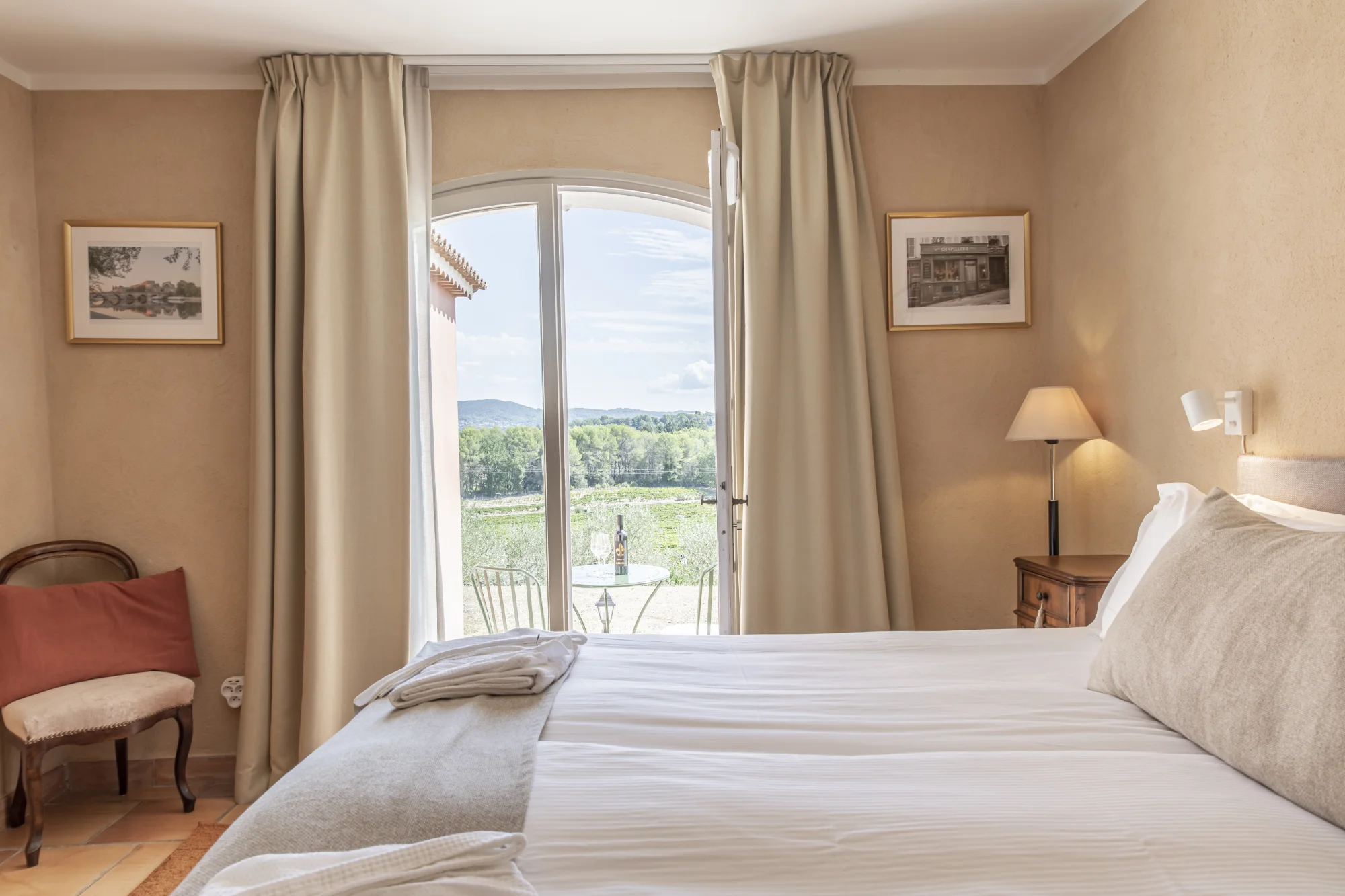 Our Classic Double Room is a Provençal retreat crafted with natural materials, soft textiles and a warm palette that mirrors the surrounding landscape. The room overlooks the vineyard’s lush greenery and invites relaxation from the very first moment. The décor blends rustic charm with modern comfort – from the handmade bathroom tiles to the linen curtains that filter the morning light. Each Classic Double Room shares the same carefully chosen materials yet differs in character and detail.